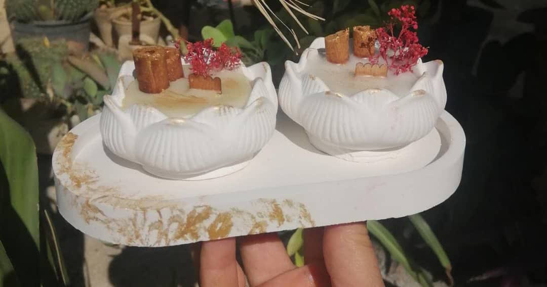 شمع و شات گل لاله سفید سنگ مصنوعی با تزیین چوب دارچین